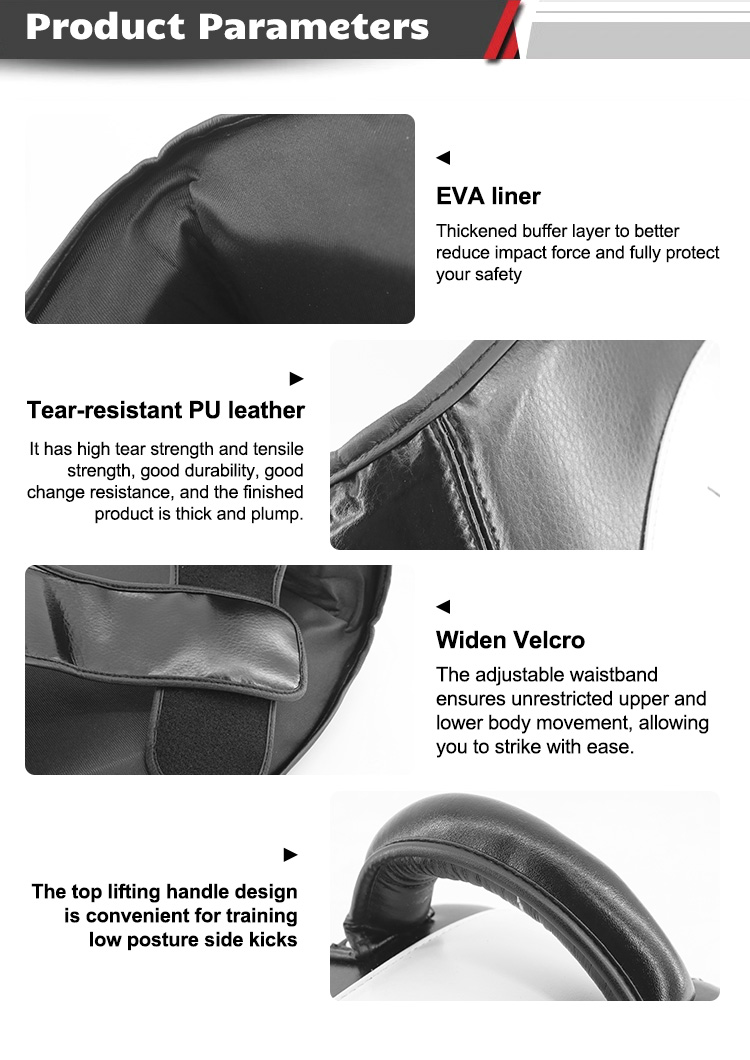 Built with an EVA liner and a thickened buffer layer, this belly pad offers excellent shock absorption and safety protection. Made of tear-resistant PU leather with great durability and elasticity. Features a widened adjustable Velcro strap for a secure fit and full mobility, plus a top handle for low posture side kick training.